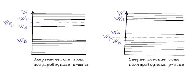 Донорные примеси образуют примесные уровни Wд, расположенные в запрещенной зоне вблизи зоны проводимости; акцепторные примеси образуют примесные уровни