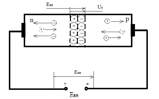 Под действием электрического поля Евн основные носители заряда будут оттягиваться от пограничных слоев p-n перехода, увеличивая дефицит свободных носителей в области перехода и расширяя переход (увеличение его толщины).