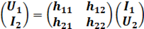 Поэтому транзистор в режиме малого сигнала можно рассматривать как линейный активный четырёхполюсник (см.рисунок), для которого существуют два уравнения, связывающие между собой физические величины: