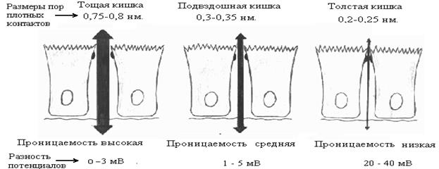 Проницаемость для ионов определяется не только размерами пор, но и электрическими зарядами на поверхности эпителия. Апикальная мембрана энтероцитов и плотные контакты имеют отрицательный заряд, что облегчает вхождение в эти зоны ионов натрия и других положительных ионов и затрудняет вхождение хлора. Трансэпителиальная разность потенциалов, поддерживается активным транспортом натрия, увеличивается в дистальном направлении. В этом же направлении возрастает электрическое сопротивление эпителия. Этот фактор, так же как и размер пор, влияет на проницаемость кишечной стенки. В отделах с большим электрическим сопротивлением - меньше проницаемость.