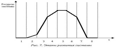 Развитие организации рассматривается как поэтапный процесс, проходящий ряд последовательных фаз (стадий). Относительно количества фаз (стадий) в литературе существуют разные мнения. А. А. Беляев и Э. М. Коротков выделяют следующие этапы жизненного цикла организации: внедрение, рост, зрелость, насыщение, спад, крах. У Карлофа можно увидеть похожие стадии: внедрение, рост на первом этапе, рост на последующих этапах, зрелость, спад. Э.А. Смирнов обосновывает развитие с позиций жизненного цикла любой системы, состоящем из восьми этапов: порог нечувствительности (1), внедрение (2), рост (3), зрелость (4), насыщение (5), спад (6), крах (7), ликвидация или утилизация (8). Данные этапы мы показали на рис. 7.