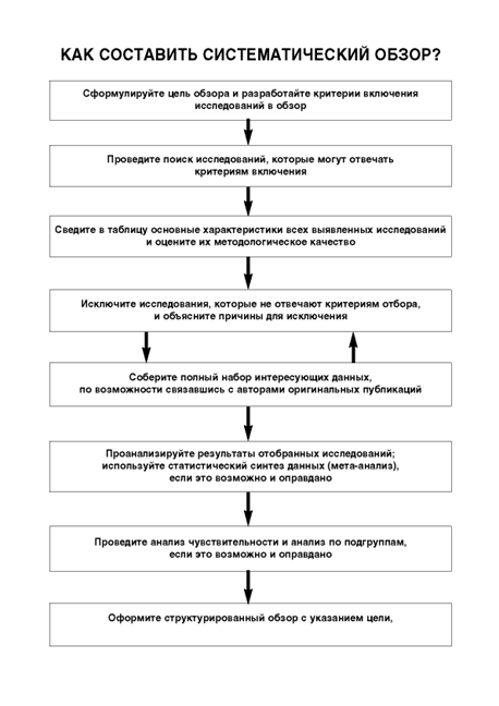 Сопоставление доказательств. Главный недостаток описательных обзоров – их подверженность к смещению оценок. Для минимизации смещения необходимо приблизить обзор к доступным доказательствам с помощью научно-систематического подхода, получившего название мета-анализа и мощное развитие в работах Ассоциации Кохрана. Выполненный таким образом обзор рассматривается как систематический и включает 6 основных этапов: