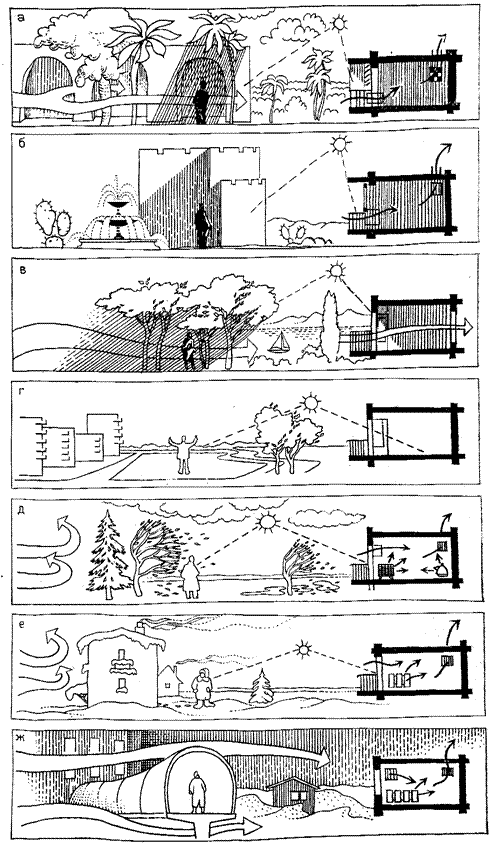 Захищає людину (див. рис. 4.2а) від перегріву, гіперінсоляції і духоти. Режим експлуатації - ізольований. Характерні об’ємно-планувальні рішення будинків з мінімальним постачанням тепла з зовні, відкриті помешкання для вечірнього і нічного перебування, використання охолоджуючої дії ґрунту, вікна зачинені, щільні, повне кондиціювання, примусова вентиляція. Запобігати випалювального кондиціювання та радіаційного охолодження.