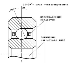 Шарикоподшипники магнетного типа обеспечивают раздельную установку внутреннего и наружного колец, т.е. являются разборными. Бывают подшипники со съемным наружным кольцом (как на рис.) или со съемным внутренним. В скоростных подшипниках магнетного типа применяют текстолитовые сепараторы (Юн-30 тыс. об/мин.). В тихоходных могут быть и металлические сепараторы.
