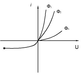 Зависимость силы фототока i от напряжения при различных значениях светового потока Ф.