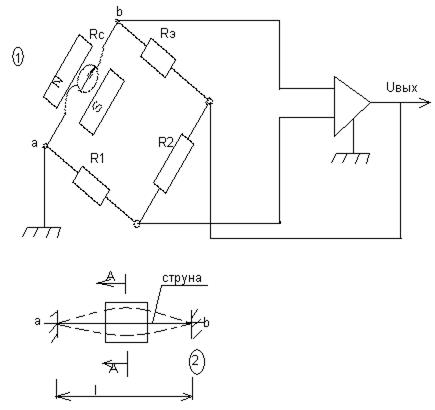 В начальный момент мостовая схематически сбалансирована, Rэ=Rc, R1=R2, т. е. связь между входом и выходом нулевая. При возникновении колебаний, внутри плеча появляется ЭДС, мост становиться разбалансирован.