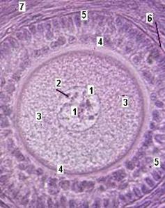 | Оболочки ооцита I | 1) Итак, в достаточно зрелом (например, в первичном) фолликуле (рис. 5.1) ооцит I – уже крупная клетка: (1) – её ядро, (2) – ядрышко, (3) – цитоплазма с желточными гранулами. 2)Вокруг ооцита I имеются следующие оболочки: а) блестящая (zona pellucida) (4) – бесклеточная, состоящая из гликопротеинов и гликозамингликанов, б) зернистая (5) – из фолликулярных клеток (эпителиальной природы) на базальной мембраной (6) в) и текальная (7) – соединительнотканная. |