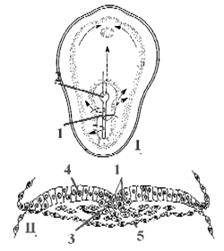 | - а отсюда клетки стекают вниз – под поверхность щитка. Поэтому в средней части поверхности диска образуются (см. рис. 6.1,а) утолщения: - первичная полоска (1) и спереди от неё – первичный бугорок (3), - а посередине их – углубления – первичная бороздка (2) и первичная ямка (4). | ||
