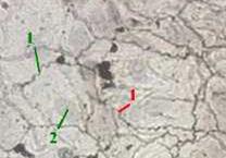 | Пример Рис. 7.1. Мезотелий брюшины Тотальный препарат. Импрегнация серебром и окраска гематоксилином | Это однослойный плоский эпителий. Но убедиться ни в том, что он однослойный, ни в том, что он – плоский, на данном (тотальном) препарате нельзя. Зато хорошо видны границы (1) клеток: между клетками фактически нет межклеточного вещества. |