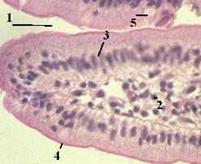 | Пример Рис. 7.2. Эпителий тонкой кишки Окраска гематоксилином и эозином | Это однослойный цилиндрический (синоним: призматический) каёмчатый эпителий (3). Он покрывает ворсинки (2) тонкой кишки. На апикальной поверхности эпителиоцитов – оксифильная щёточная каёмка (4), образованная микроворсинками. |