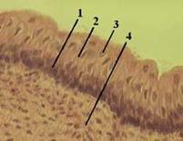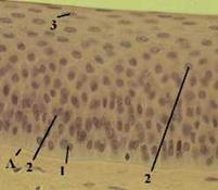 | Рис. 7.5. Передний эпителий роговицы Окраска гематоксилином и эозином | Это многослойный плоский неороговевающий эпителий. Он же – в полости рта и в пищеводе. В его составе условно выделяют тоже 3 слоя: - базальный (1), - шиповатый (2), чьи клетки содержат многочисленные «шипики», образующие десмосомы, и - наружный слойплоскихклеток. |