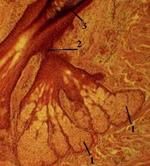 | Рис. 7.4. Эпителий мочевого пузыря Окраска гематоксилином и эозином | В мочевыводящих путях – переходный эпителий: при растяжении органа уплощается, т.е. переходит от одной формы к другой. У него – 3 слоя: - базальный (1), - промежуточный (2) и - поверхностный (3) из крупных клеток с округлыми ядрами. |