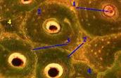 | 3) Вставочные пластинки | Между остеонами обычно находятся вставочные пластинки (4) – остатки прежних остеонов. |