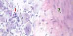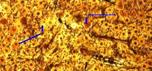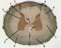 | Ориен-тация в препарате | Минимум по трём признакам можно отличить на препарате переднюю часть спинного мозга от задней: 1) передние рога – шире и короче, чем задние; 2) в передних рогах содержатся самые крупные клетки – мотонейроны, 3) между передними канатиками имеется глубокая срединная вырезка (10), заполненная мягкой мозговой оболочкой (в виде чёрной полоски). |