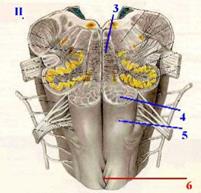 | Нисходящие (эфферент-ные) пути | 1,а) Главный нисходящий путь – это пирамидный тракт (4), расположенный перед медиальной петлёй и идущий без переключения - от коры передней центральной извилины больших полушарий - к мотонейронам передних рогов спинного мозга. 1,б) Спереди этому пути соответствуют выпуклые тяжи – т.н. пирамиды (5). А часть волокон левого и правого трактов тоже переходит на противоположную сторону, образуя перекрёст (6). 1,в) По пирамидным путям передаются сигналы к осознанным произвольным движениям. 2) Имеются также нисходящие пути от некоторых ядер ствола мозга к мотонейронам спинного мозга, участвующие в сложных рефлекторных двигательных реакциях (например, при нарушении равновесия тела). | |