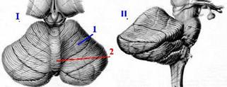 | Составные части Рис. 15.3. | 1) В мозжечке различают полушария (1) и находящийся между ними червь (2). 2) На поверхности имеются извилины и борозды. |