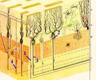 | Три слоя коры | В коре мозжечка различают 3 слоя (начиная с поверхностного): а) молекулярный (1), нейроны – корзинчатые и звёздчатые; б) ганглионарный (2), нейроны – грушевидные, или клетки Пуркинье; в) зернистый (3), нейроны – клетки-зёрна, клетки Гольджи и веретеновидные. |
