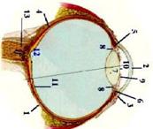 | 2) Сосудистая оболочка(средняя): - собственно сосудистая оболочка (chorioidea) (4) – под склерой; - цилиарное тело (5) – в области лимба, содержит цилиарную мышцу; от тела отходят цилиарные отростки (6), а от них – волокна цинновой связки (8), вплетающиеся в капсулу хрусталика (7); - радужка (9) – дисковидная структура со зрачком (10) в центре и с миоцитами вблизи задней поверхности, меняющими ширину зрачка. | |