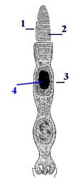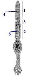 | - в палочках – около 1000 плоских мембранных дисков (4), содержащих в мембране множество молекул светочувствительного белка родопсина. б) С помощью родопсина палочки обеспечивают чёрно-белое восприятие объектов. | - в колбочках – мембранные полудиски (4), т.е. инвагинации плазмолеммы в цитоплазму сегмента; в их мембране – светочувствительный белок иодопсин. б) По виду иодопсина колбочки делятся на три группы, воспринимающие только синие, только зелёные или только красные волны. | |||