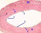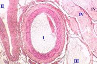 | 1) Артерии обычно идут рядом с венами и нервами, образуя вместе с ними сосудисто-нервные пучки. 2) В представленном на снимке пучке видны: - артерия (I) мышечного типа cо всеми тремя характерными признаками (складчатостью, внутренней эластической мембраной, высоким содержанием миоцитов в t. media); - вена (II), где нет ни одного из этих признаков, - лимфатический сосуд (III) и нерв (IV). | \
