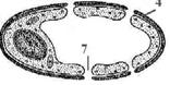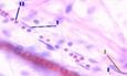 | Циркулярно расположенные миоциты создают «поперечную исчерченность» сосуда. Эритроцитов обычно не видно. | Через стенку капилляра видны эритроциты, но, из-за его небольшого диаметра, они идут в 1 ряд. В венуле (I) они уже – в 2 ряда. | В венулах, как уже сказано, нет миоцитов, т.е. нет и поперечной исчерченности. Просвет заполнен эритроцитами. |