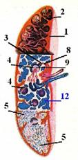 | Ток крови через селезёнку (см. рис.21.5) | Селезёночная артерия → трабекулярные артерии → пульпарные артерии эллипсоидные ← кисточковые артериолы ← артерии узелков ←↓ артериолы → короткие капилляры → венозные синусы →↓ селезёночная вена ← трабекулярные вены ← пульпарные вены |
