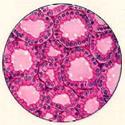| Гипо-функция | 1) При гипофункции а) тироциты уменьшаются в объёме и уплощаются, б) при этом их выделительная функция страдает сильней, чем белокпродуцирующая, в) поэтому объёмы коллоида и фолликула возрастают; коллоид уплотняется, вакуоли в нём исчезают. 2) Такое состояние (гипотиреоз) приводит к заболеванию, обозначаемому как микседема. |