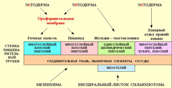 | Сделаем пояснения относительно орофарингеальной мембраны. а) На более ранней стадии развития это т.н. прехордальная пластинка – небольшой участок в головной части зародыша, где в процессе гаструляции не оказывается мезодермы, так что эктодерма и энтодерма вплотную прилежат друг к другу. б) Затем данный участок (объединяющий материал экто- и энтодермы) начинает впячиваться, формируя первичную ротовую полость, и какое-то время отделяет эту полость от слепого переднего конца первичной кишки. Отсюда и термин: «орофарингеальная (ротоглоточная) мембрана». В итоге, эпителий переднего отдела пищеварительной трубки имеет смешанное (экто-энтодермальное) происхождение. |