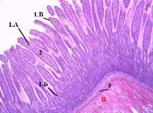 | Состав ворсинок | а) Под эпителием ворсинки содержится строма (РВСТ) – часть собственной пластинки слизистой оболочки, а в ней: - макрофаги, лимфоциты и плазмоциты, - густая сеть кровеносных капилляров фенестрированного типа, - один или несколько лимфатических капилляров, которые начинаются слепо на верхушке ворсинки и идут вдоль её оси, - большое число безмиелиновых нервных волокон и их окончаний, а также отдельные гладкие миоциты – представляющие, но не исчерпывающие, мышечную пластинку слизистой оболочки. б) Своими периодическими (4-6 1/мин) сокращениями миоциты способствуют проникновению продуктов переваривания в капилляры ворсинки. | |
