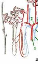 | Дальнейший ход кровотока: vas eff. → капилляры канальцев (7) → звёздчатые венулы (8) → междольковые вены (9) → дуговые в. (10) → междолевые в. (11) → почечная вена. | В данной системе vas eff. продолжается в прямую артериолу, идущую за петлёй Г. в мозг. в-во. От неё-то и отходят капилляры канальцев. Они собираются в прямую венулу, кот. впадает сразу в дуговую вену. | |||||