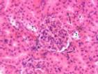 | Из предыдущего следует, что в корковом в-ве почек содержатся: I. почечные тельца, II. проксимальные и III. дистальные извитые канальцы. I. В тельцах можно разглядеть наружный листок и щелеобразную полость капсулы Шумлянского-Боумена. Внутри же находится конгломерат из 3-х видов клеток – эндотелиоцитов капилляров, подоцитов внутреннего листка капсулы, а также впервые упоминаемых мезангиальных клеток. |