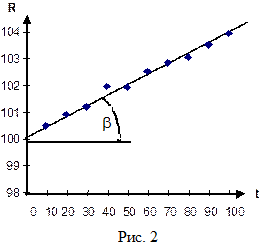 Так как зависимость R от t должна носить линейный характер, то график должен иметь вид прямой линии. Поскольку экспериментальные точки не лежат на прямой, то проведем график с таким расчетом, чтобы полученные точки располагались в основном равномерно по обе стороны от графика.