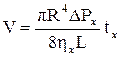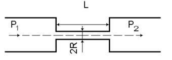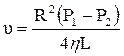 Скорость протекания жидкости по центру трубе υ зависит от разности давлений (Р1-Р2) на концах трубы, ее длины L, радиуса R и вязкости жидкости: