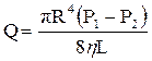 Формула Пуазейля определяет зависимость Q - объема жидкости, протекающей за единицу времени через трубу длиной L, радиусом R, при разности давлений на концах трубы (Р1< Р2), от вязкости
