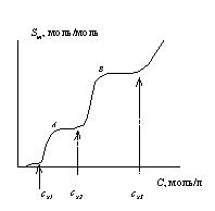 Изотермы солюбилизации чаще всего имеют вид, приведенный на рисунке. Это - кривая, не проходящая через начало координат, так как солюбилизация возможна только после образования мицелл. Солюбилизацию выражают либо по аналогии с растворимостью как количество вещества в единице объема раствора ПАВ, т.е. моль/л, либо относят к одному молю мицеллярного ПАВ (тогда говорят о молярной солюбилизации, её размерность будет моль солюбилизата/моль ПАВ). Последнее выражение солюбилизации позволяет проследить за мицеллярными переходами, так как солюбилизационная емкость меняется при трансформации формы мицелл, например, от сферической к сфероцилиндру и затем к пластинчатым (ламеллярным) мицеллам.