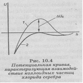 На рис. 10.4 представлены потенциальные кривые, характеризующие взаимодействие частиц в этом золе. Дзета-потенциал исходной коллоидной частицы положительный, это создает потенциальный барьер коагуляции ΔUK > 0 (кривая 1). Поэтому при столкновении коллоидные частицы отталкиваются друг от друга, коагуляция не происходит. После добавления нитрата калия дзета-потенциал становится равным нулю и ΔUk — 0 (кривая 2). Поэтому ничто не мешает коллоидным частицам сблизиться на такое расстояние, где преобладают силы притяжения — происходит коагуляция. Так как в данном случае причиной коагуляции является увеличение концентрации противоионов, она называется концентрационной коагуляцией.