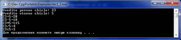Строка 5 печатает текст, находящийся в кавычках, пробелы между словами не игнорируются. В дальнейшем текст между кавычками будем называть сообщением или строковым литералом. Символы "<<" называются операциями передачи в поток. Данные символы используются вместе с оператором вывода cout. Оператор endl переносит курсор на следующую строку.