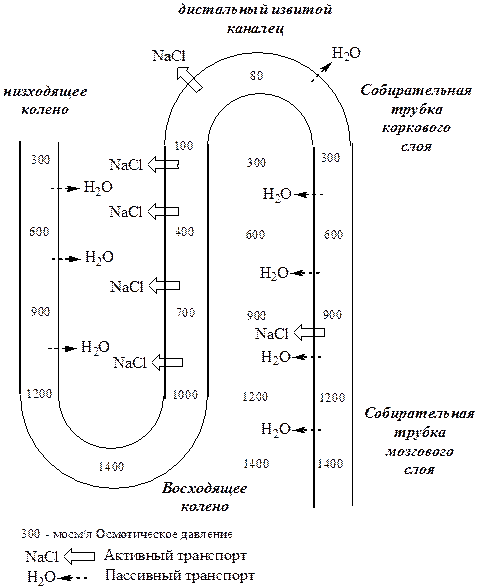 Особое взаимное расположение отдельных участков почечных канальцев и неравномерное распределение на них систем активного транспорта NaCl позволяет существенно концентрировать вторичную мочу.