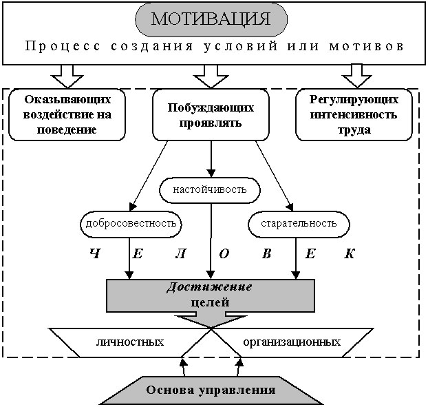 Мотивация представляет собой процесс создания системы условий или мотивов, оказывающих воздействие на поведение человека, регулирующих интенсивность его труда, побуждающих проявлять добросовестность, настойчивость, старательность при достижении целей. Мотивация – это процесс побуждения себя и других для достижения личностных целей и целей организации, это основа управления человеком.