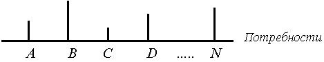 На схеме (см. рис. 4) показано, что может существовать несколько потребностей в одно и то же время. Та потребность, которая сейчас проявляется сильнее, и будет определять ваше поведение в данный момент. В этом случае потребность «В». Длина линии показывает величину потребности, и то, как эта потребность управляет поведением человека. Предположим, что эта схема относится к вам. Некоторым из вас все это очень надоело. И вы думаете, что вам хочется быть в другом месте. Но вы сидите здесь, а преподаватель рассказывает вам о том, что ваше поведение определено наиболее сильной из ваших потребностей.