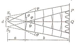 Так как <POQ = 2φ, а точки S, S1 и S2 лежат на одной окружности радиуса r = OS = OS1 = OS2, расстояние между мнимыми источниками S1 и S2