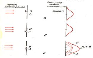 Здесь пучок ускоренных электронов падает на экран с двумя узкими щелями. Если закрыть одну щель, то электроны, прошедшие через другую, рассеются так, как показано на рис. 13.7 а.