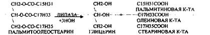Т.о. в результате гидролиза пищевого жира образуются глицерины, холестерины, ВЖК, фосфаты, азотистые основания. Необходимо отметить, что в расщеплении жиров принимают участие и кишечные ЛИПАЗЫ, но их активность невысока, к тому же они расщепляют только МОНОГЛИЦЕРИДЫ и не действуют на ДИ- и ТРИГЛИЦЕРИДЫ,