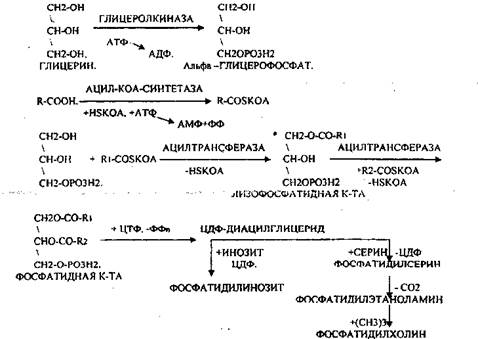 Сначала происходит активация глицерина и ВЖК, затем последовательно будут происходить АЦИЛИРОВАНИЕ альфа ГЛИЦЕРОФОСФАТА с образованием МОНО- и ДИГЛИЦЕРИДОВ. Активная форма ДИГЛИЦЕРИДА - ФОСФАТИДНАЯ К-ТА занимает центральное место в синтезе жира к стенке кишечника. Из неё после активации в присутствии ЦТФ образуется ЦДФ -ДИАЦИЛГЛИЦЕРИД, который дает начало сложным жирам.