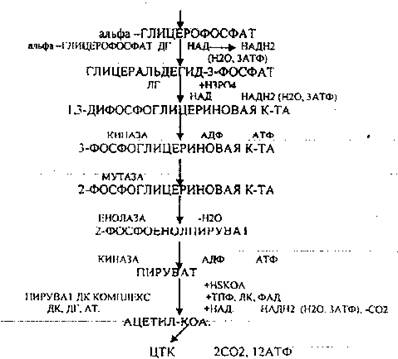 Распад жиров в клетках происходит в лизосомах, меньше в микросомах и цитоплазме при участии тканевых ЭСТЕРАЗ. В результате гидролиза жира образуются общие метаболиты: глицерины и ВЖК, окисление которых сопровождается образованием конечных продуктов: воды и углекислого газа и выделением энергии в форме АТФ. Окисление глицеринов в тканях тесно связано с ГЛИКОЛИЗОМ, в который вовлекаются метаболиты обмена глицерина по следующей схеме: