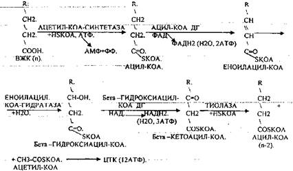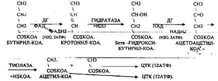Окисление ВЖК в тканях изучалось Ф. КНООПОМ (1904г.), который назвал окисление ВЖК бета - окислением. Он показал, что процесс этот циклический, что все ВЖК, имеющие чётное количество углеродных звеньев в цепи обязательно проходят окисление, когда цепь периодически укорачивается на 2 углеродных звена. Последняя стадия окисления - стадия превращения масляной кислоты имеет свои особенности, когда в результате 1 цикла окисления образуется 2 молекулы АЦЕТИЛ-КОА, Одна проходит окисление с выделением 5 АТФ, а другая нет.