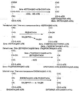 Третий этап. Этап конденсации МАЛОНИЛА-АПБ и АЦЕТИЛА-АПБ с участием ТРАНСФЕРАЗЫ - СИНТАЗЫ.