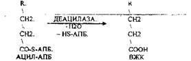 Т.о. завершается 1 цикл синтеза ВЖК образованием масляной кислоты (БУТИРИЛ-АПБ). В дальнейшем последовательно и циклично к 4-углеродному фрагменту будут присоединяться молекулы МАЛОНИЛ-КОА. Для подсчёта количества циклов синтеза ВЖК, подсчета молекул АТФ, МАЛОНИЛ-КОА -можно пользоваться формулой: N/2 - 1, где N - это число углеродных звеньев в молекуле ВЖК. Завершается биосинтез любой ВЖК в тканях ДЕАЦИЛАЗНОЙ реакцией.