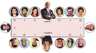 Места за столом делятся на более почетные и менее почетные. Самое почетное место – справа от хозяйки (на приеме с участием женщин) и справа от хозяина (на мужском приеме). Далее идут места слева от хозяйки, слева от хозяина. Но эта практика имеет исключения. Например, в Китае почетными местами считались места с левой стороны от хозяев. В Швеции почетный гость садится слева от хозяйки дома, а почетная гостья – справа от хозяина. По мере удаления от хозяйки и хозяина места становятся менее почетными. Главное правило рассадки: на самых почетных местах сидят самые почетные гости. При рассадке за столом придерживаются следующих правил: