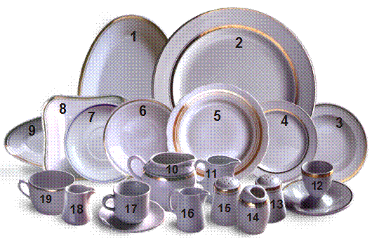 1 – блюдо овальное (длиной 350 – 400 мм) для закусок из рыбной и мясной гастрономии; 2 – блюдо круглое (диаметром 300 – 350 мм) для мясных и овощных блюд; 3 – тарелка столовая глубокая (300 см3) для супов полупорциями; 4 – тарелка столовая мелкая (диаметром 240 мм) для рыбных, мясных блюд, блюд их птицы, дичи и др.; 5 – тарелка столовая глубокая (500 см3, диаметром 240 мм) для супов полными порциями; 6 – тарелка закусочная (диаметром 200 мм); 7 – блюдце чайное (диаметром 185 мм) под стакан; 8 – салатник квадратный для салатов, солений, маринадов; 9 – лоток, селедочница для рыбной гастрономии; 10 – соусник (400 см3) для холодных соусов или сметаны; 11 – соусник (200 см3) для холодных соусов или сметаны; 12 – рюмка-подставка для яиц; 13 – солонка; 14 – горчичница;